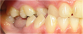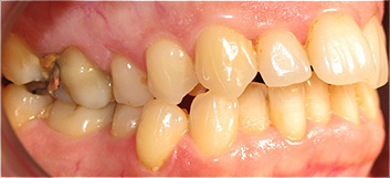 Extrusão acentuada dos molares superiores do lado esquerdo e ausência dos molares inferiores.