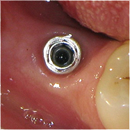 O implante dentário é enroscado ou impactado no osso, onde será posteriormente ósseo-integrado, servindo de pilar para colocação das coroas dos dentes ausentes.